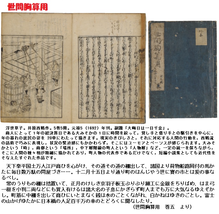 当時の人口ははっきりとは判りませんが、約35万はあったと思われます。城下町としての江戸の発展、経済都市としての江戸の繁盛――最早江戸は十七世紀半~十八世紀にかけて実質的にも日本の中心地としてその基礎が確立されたのです。西鶴の妙筆はさらにつづきます。