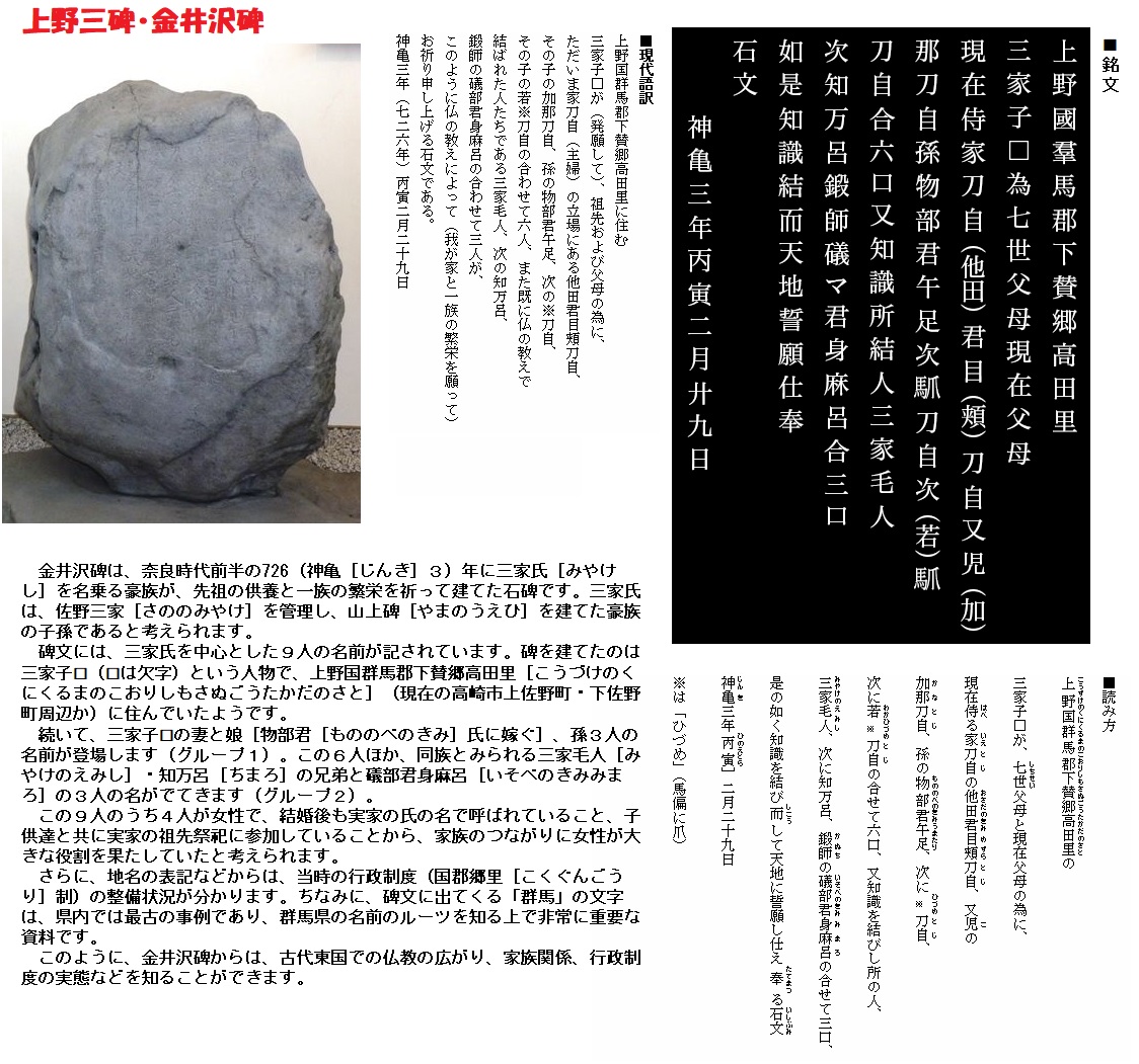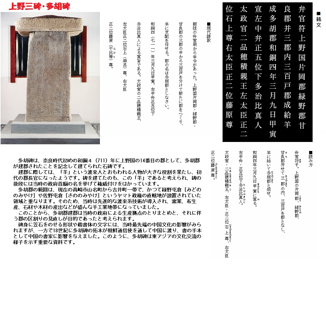 上野三碑は、飛鳥時代~奈良時代前期、今の高崎市内に建てられた「山上(やまのうえ)碑(ひ)」「多胡碑(たごひ)」「金井沢碑(かないざわひ)」の総称。朝鮮半島からの渡来人との交流から生まれたものとされ、漢字や仏教の広がりなど東アジアの文化交流を示す資料だ。