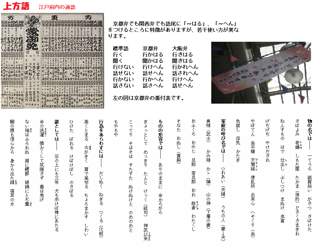 今までただ関東方言とか東国語(阪東語)と呼ばれていた方言の中から、新しく江戸のコトバが生まれてくるのもこの頃でした。厳密にいいますと江戸府内の確立と江戸府内のコトバの誕生とが表裏一体のものとして考えられなければならないのです。しかし江戸府内は上方や諸国からの人も多いわけでありますから、コトバは当然上方語と関東方言の二つを要素としているわけです。西鶴などによって描かれた上方語も江戸府内の通語の一つでした。ごく簡単に当時の上方語を見ると次のようです。