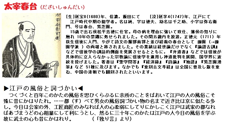 春台は儒者であり知識人ですから、彼の観察の対象もいささか上層階級に限られているかも知れません。ともかく、江戸が京都化してきたということは一つの傾向として、是認されてもよいでしょう。同じ儒者である室鳩巣も、