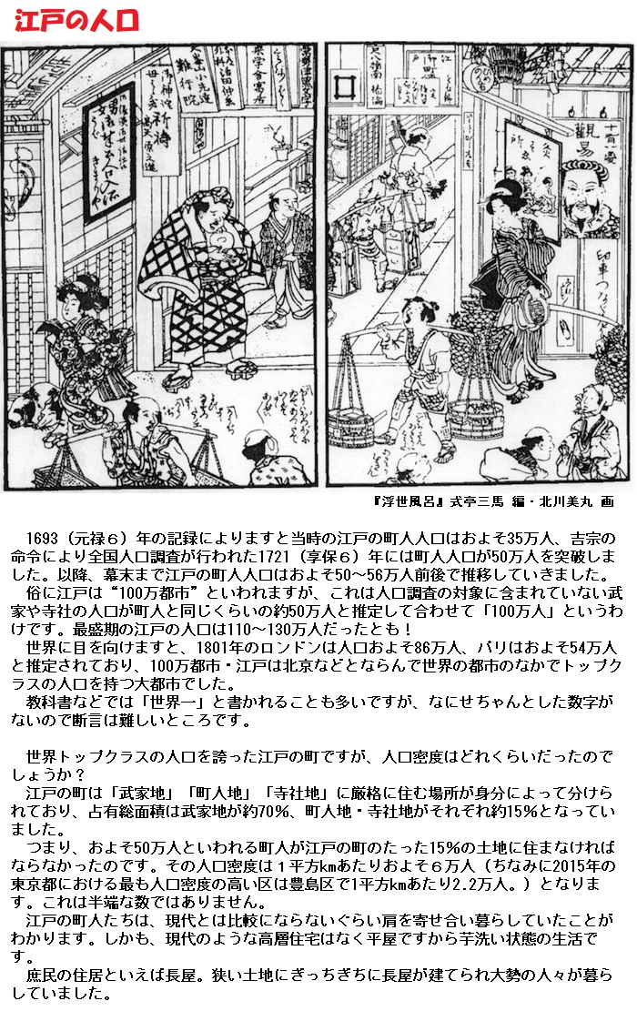 享保六年、江戸の人口は武家と町人を合わせて約73万5千人、天明七(1787)年の調べでは約128万5千人となっています。これらには出家・神主・遊女などは含まれていません。