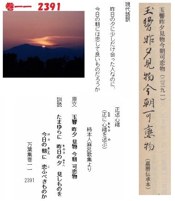 この歌は早く平安時代から、「たまゆらに 昨日の夕 見しものを 今日の朝に 恋ふべきものか」(『古今六帖』)と読み慣わされてきました。以後「たまゆら」は『万葉集』に典拠を持つ優雅な歌語として歌人の愛好するところとなります。かれらは「たまゆら」を「しばし」の意に理解していました。