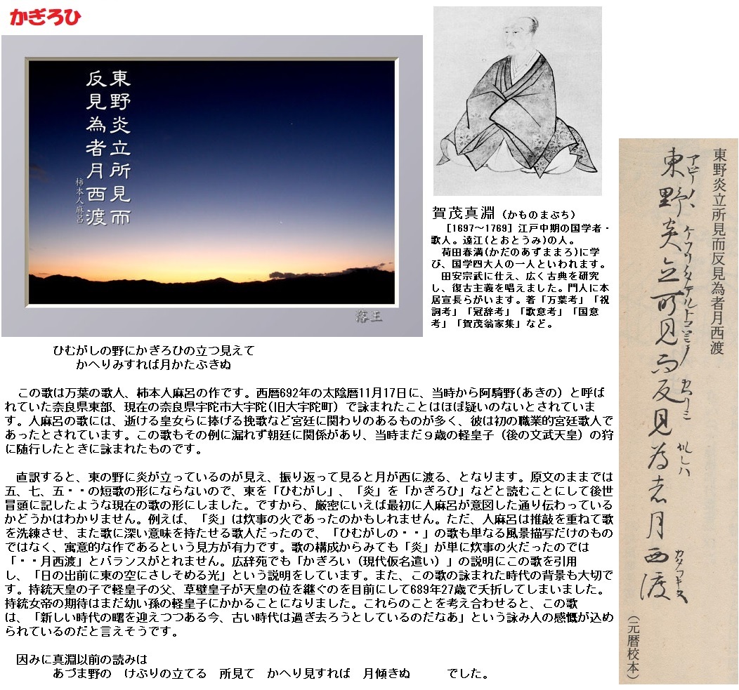 古い写本を見ると、この原文には「アツマノヽケフリノタテルトコロミテカヘリミスレハツキカタフキヌ」という訓が付されています。つまり、第一句から第三句までの <東野炎立所見而> は、もともと「東野《あづまの》の煙《けぶり》の立てる所見て」と解釈されていたのです。それを「みだり訓(いい加減な訓/まずい訓)」だと断定し、現在一般化している「東の野にかぎろひの立つ見えて…」という訓を考案したのが、江戸時代の賀茂真淵《かものまぶち》です。馬淵がこの新訓を提示してからは、研究者も歌人も「東野《あづまの》の煙《けぶり》の立てる所見て」という伝統的な訓と解釈を捨ててしまったのです。