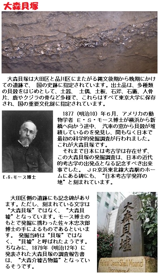 明治10(1877)年、当時帝国大学で動物生物学の講義を受け持っていたアメリカ人Edward S.Morse(エドワード・モールス)は、国電大森駅を過ぎる時、車窓から貝塚らしいもののあるのを発見、すぐに発掘に取り掛かりました。その貝塚からは石器・土岐・人骨などが多数発見され、地名にちなんで『大森貝塚』と名付けられました。これこそ日本の考古学の夜明けを告げる永遠の記念碑であり、昭和の登呂遺跡の発見に勝るとも劣らない重要な事件でした。謎に包まれた太古日本の姿はその1ページを異国の学者の手によって開かれたのです。大森貝塚の発見によって、太古東京近辺にも人間の住んでいたことが実証されたのです。