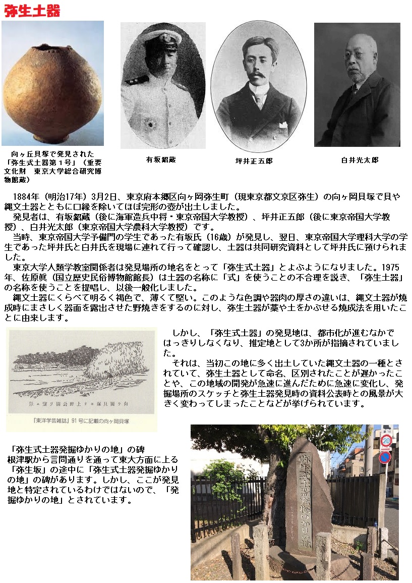 次いで、明治17年3月、当時帝国大学の学生であった有坂鉊蔵によって、本郷弥生町の発見されました。いわゆる弥生土器というのはこの町名に由来しているのです。この発掘により、大森貝塚の場合と同様に昔から東京付近は人間が住み、特に弥生文化は米作農業を基盤としたかなり程度の高い文化の営みであると想定されたのです。