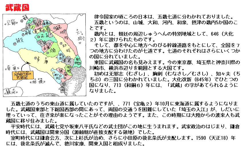 ムサシが武蔵と書かれたのは、神護景雲の年(767年)とされ、それ以前は无邪志・牟射志・牟佐之・胸刺などと書かれ、ムサシ(ムザシ)と呼ばれていました。住民の事などからして朝鮮語のムサ+シ(麻の原料である苧〈からむし〉の種子)とか、アイヌ語のムニ+サツ+ウシ → ムサシ(草の茂っている原野)などの説があります。いずれも宛字であって命名の本意は不詳というのが本当のところでしょう。