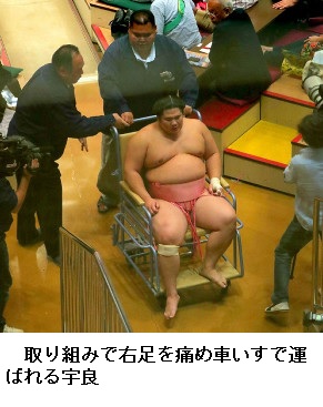 宇良は、西前頭5枚目・貴景勝(21)=貴乃花=に突き倒された際に右膝を負傷。取組後も動けず車いすで支度部屋へ。運ばれている最中、「ずれた。うわー、終わったなコレ」と話した。
