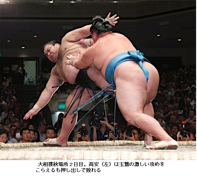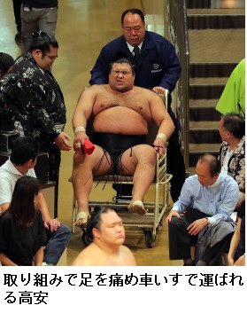 高安は東小結・玉鷲(32)=片男波=に押し出され、右足を痛めた。花道を歩いて下がろうとしたが、途中から用意された車いすで下がった。また、高安を破った玉鷲も右の足首を負傷した様子で、荒れる土俵となった。 (2017年9月11日18時52分 スポーツ報知)
