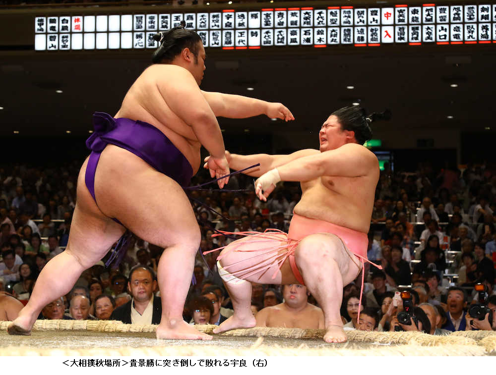貴景勝に敗れた宇良は、踏ん張った際に右膝を痛め土俵下で苦悶の表情。車椅子で診療所に向かう途中で「わー、終わったな、これ」とつぶやいた。それでも診療所を出るときには自力で歩き、車に乗り込んだ。