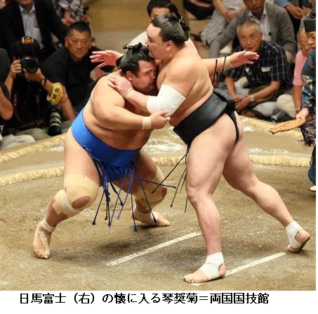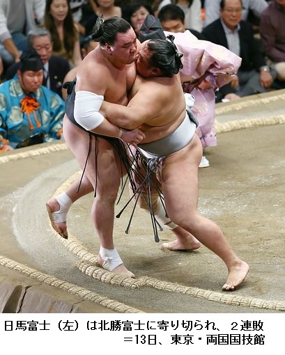 日馬富士は北勝富士に逆転負けし、連日の金星配給で2敗。北勝富士は二つ目の金星。