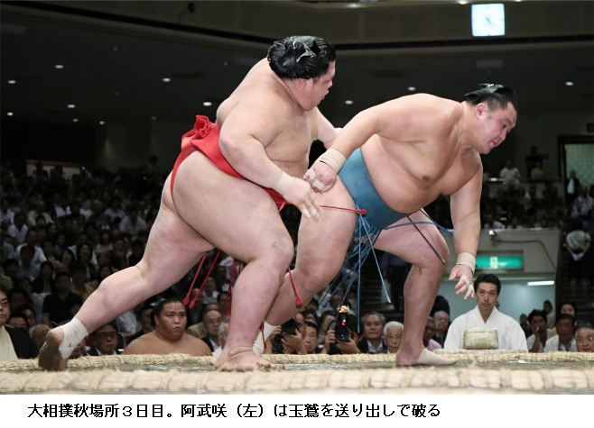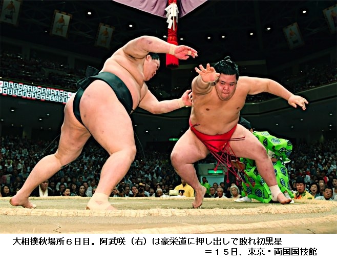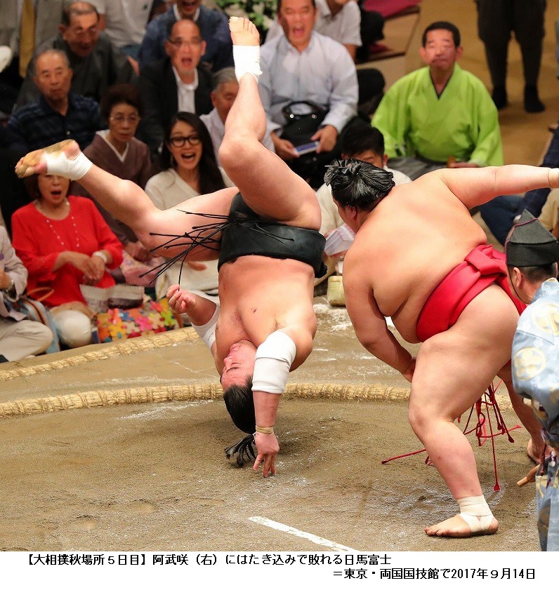 大相撲秋場所 日馬が3日連続の金星配給 阿武咲5連勝 ―― 大相撲秋場所5日目の14日、日馬富士は平幕・阿武咲の動きについていけず3連敗。3日連続で金星を配給するのは、2003年名古屋場所の武蔵丸以来。阿武咲は、唯一の5連勝。