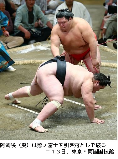 阿武咲、21歳の躍動=初の大関戦で照ノ富士撃破-大相撲秋場所 ―― 初の大関戦。21歳の阿武咲は、照ノ富士の巨体を前にしても動じなかった。しっかり手をついて待つと、気おされたように大関が「待った」をかけて場内がどよめく。平然と仕切り直した阿武咲は低く当たって突き起こし、タイミングのいい引き落としで快勝した。