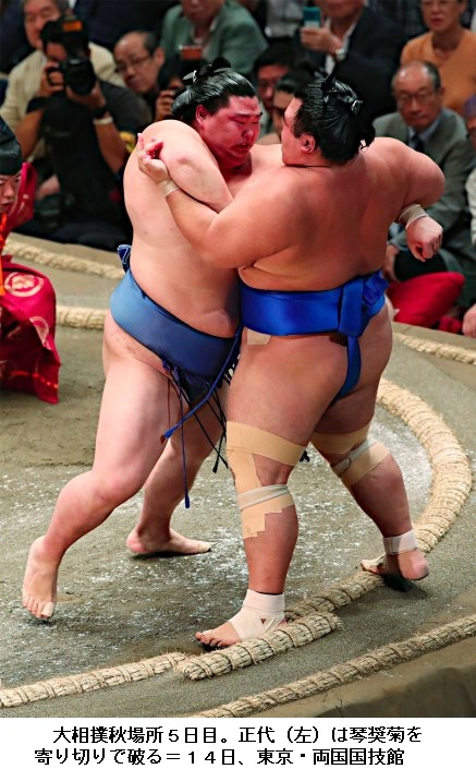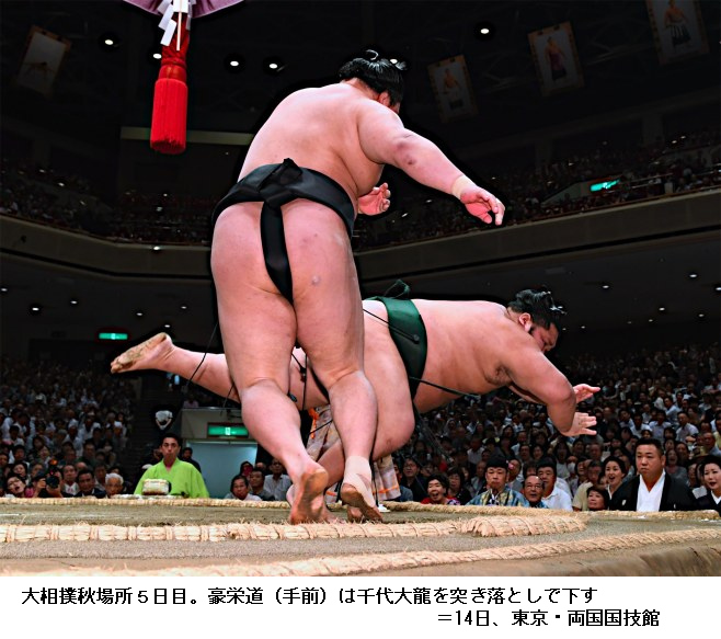大関かど番の豪栄道は栃ノ心を注文相撲で退けて2日目から3連勝。照ノ富士は大関初挑戦の阿武咲の引き技を食い3敗。4連勝は関脇嘉風を破った琴奨菊、阿武咲、千代大龍、貴ノ岩、大栄翔の平幕5人。 (JIJI.COM 2017/09/13-18:40)