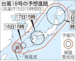 台風18号、17日朝にも鹿児島付近に上陸の恐れ ―― 大型で強い台風18号は16日、九州の西の海上を東寄りに進み、17日朝に鹿児島県付近に上陸する恐れがある。その後は速度を上げ、18日午後には北海道に達する見通し。活発な前線に台風本体の雨雲も重なり、気象庁は大雨や暴風への警戒を呼びかけている。