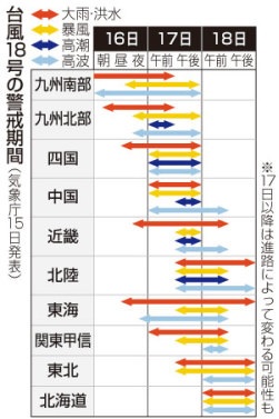 18号は18日にかけては速度を上げて東・北日本へ進む可能性がある。台風が接近すると急に風雨が強まるため、早めの安全確保が必要。港湾や海岸では高潮による浸水や冠水が起きる恐れもある。