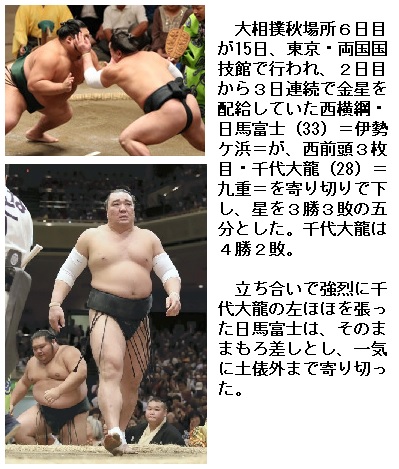 大相撲秋場所は3日目にして、宇良・高安が休場、ただ一人の日馬富士に土、大関豪栄道・照ノ富士もまだ本調子ではないようです。まあ、体も一回り大きくなった千代大龍、若手の貴景勝・阿武咲らの活躍を期待します。