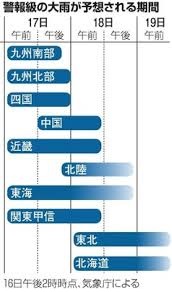 17日以降は台風本体の雨雲も重なり、西日本から東日本、北日本の広い範囲で非常に激しい雨が降り、局地的には猛烈な雨が降る恐れがある。