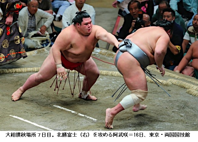 1918年夏場所以来、99年ぶりに3横綱2大関が休場する事態となった秋場所7日目が行われ、前日に今場所初黒星を喫した東前頭3枚目・阿武咲(21)=阿武松=が、東前頭2枚目・北勝富士(25)=八角=を押し出しで破り、1敗を死守した。