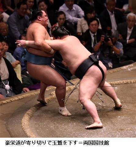 かど番の大関豪栄道は小結玉鷲を寄り切って1敗を守った。左膝負傷で休場中の大関照ノ富士は再出場しないことになり、来場所の関脇転落が決まった。関脇陣は嘉風が勝って御嶽海は負け、ともに4勝4敗。