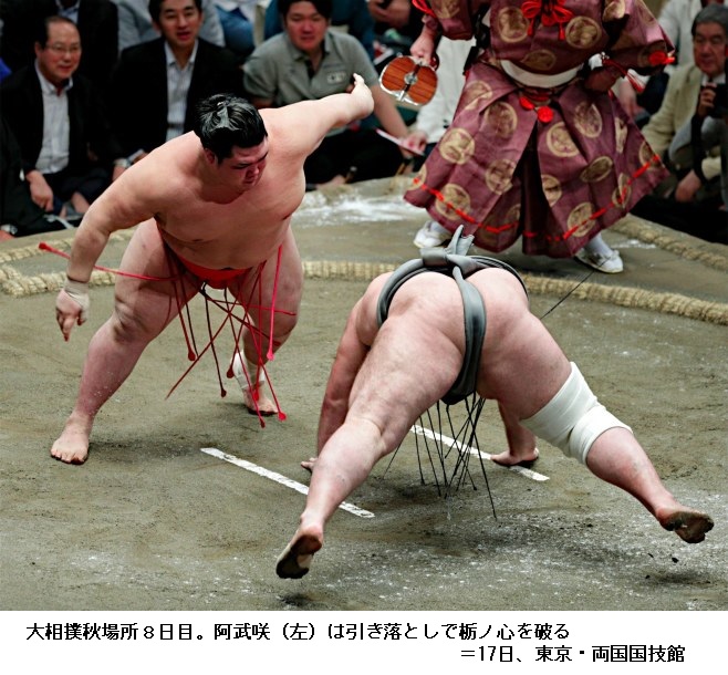 立ち合いは右で張ってから左でかちあげ、相手をのけぞらせた。さらに回転の良い突っ張りで上体を起こす。そして狙い澄ましたような引き。八角理事長(元横綱・北勝海)も「阿武咲は、まんまと(やられた)ね」。