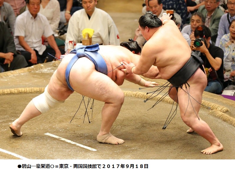 豪栄道は、前頭2枚目の碧山(31=春日野)に、立ち合い頭で当たって最後は左に回り込んで突き落とし。8勝1敗で勝ち越しを決め、かど番を脱出した。