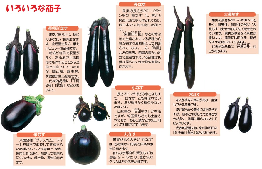 世界の各地で独自の品種が育てられています。賀茂茄子などの一部、例外もありますが、日本においては南方ほど長実または大長実で、北方ほど小実品種となります。本州の中間地では中間的な中長品種が栽培されてきました。これは寒い地域では栽培期間が短く大きな実を収穫する事が難しい上に、冬季の保存食として小さい実のほうが漬物に加工しやすいからであります。しかし食文化の均一化やF1品種の登場により野菜炒めや焼き茄子など、さまざまな料理に利用しやすい中長品種が全国的に流通しています。