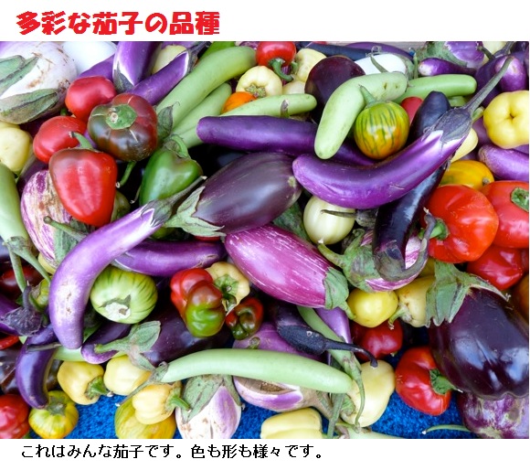 日本で栽培される栽培品種のほとんどは果皮が紫色又は黒紫色ですが、ヨーロッパやアメリカ等では白・黄緑色・明るい紫、さらに縞模様の品種も広く栽培されています。