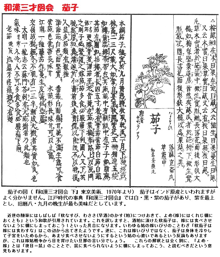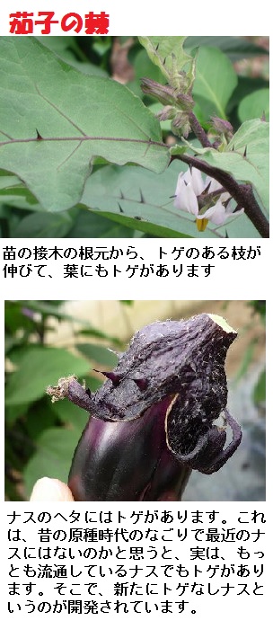 実の味から「中酸実」(なかすみ)が語源とされます。夏に実がなるので「夏実」(なつみ)と呼びましたが、それが訛って「なすび」(奈須比)と呼ばれたとする説もあります。室町時代頃に宮廷の女官が女房言葉として「なす」と呼び、その呼称が定着したようです。元は貴重な野菜でしたが、江戸時代頃より広く栽培されるようになり、以降日本人にとってなじみのある庶民的な野菜となりました。葉とヘタには棘があり、葉には毛が生えています。