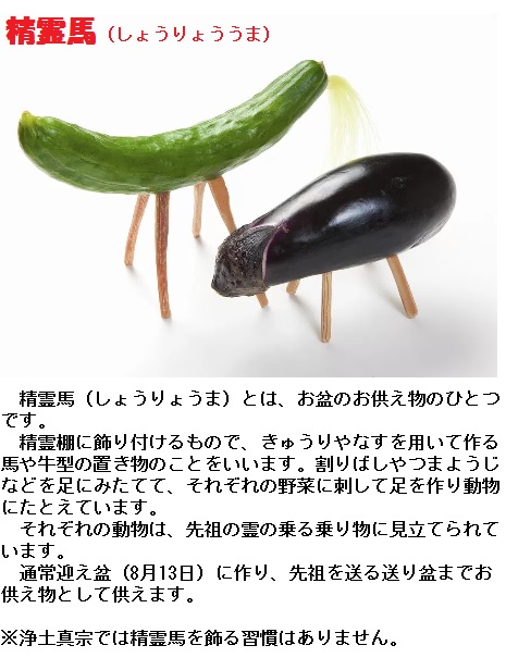 お盆の期間中には、故人の霊魂がこの世とあの世を行き来するための乗り物として、「精霊馬」と呼ばれるキュウリやナスで作る動物を用意します。4本の麻幹あるいはマッチ棒、折った割り箸などを足に見立てて差し込み、馬、牛とします。キュウリは足の速い馬に見立てられ、あの世から早く家に戻ってくるように、ナスは歩みの遅い牛に見立てられ、この世からあの世に帰るのが少しでも遅くなるように、また、供物を牛に乗せてあの世へ持ち帰ってもらうとの願いが込められているといいます。