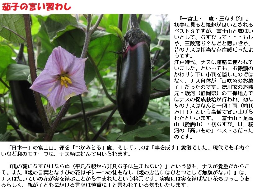 「親の小言と茄子の花は千に一つの無駄もない」というのは、ナスの花が結実する割合が高いことに、親の小言を喩えた諺です。また、「瓜の蔓に茄子(なすび)はならぬ」は非凡な子供を茄子に例えて、平凡な親からは非凡な子は生まれない、という意味で、似た諺として「蛙の子は蛙」があります。