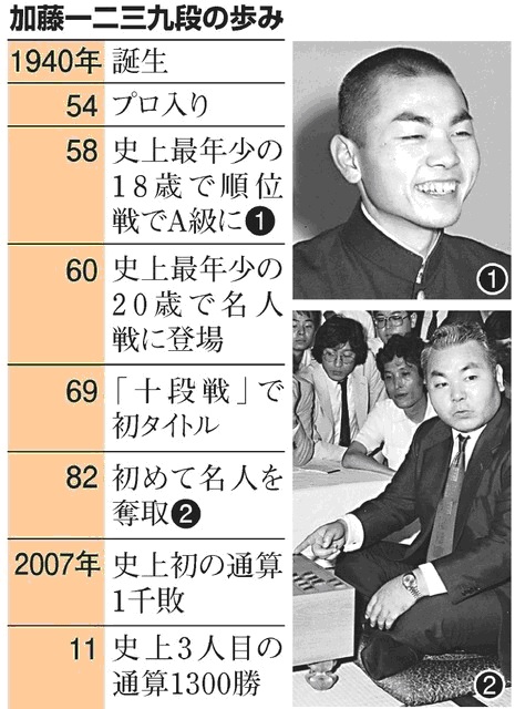 加藤九段、63年間の現役生活に幕 投了後、無言で退出 ―― 将棋の史上最年長棋士、加藤一二三(ひふみ)九段(77)が20日、東京都渋谷区の将棋会館で行われた対局に敗れた。名人など数々のタイトルを獲得した名棋士が、約63年間の現役生活に幕を閉じた。
