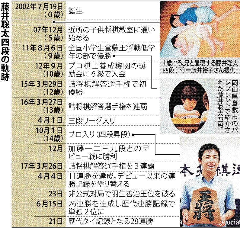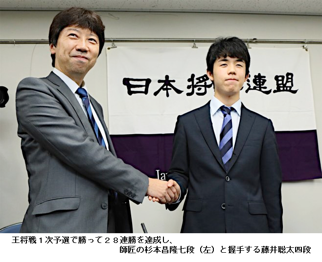 昇竜14歳金字塔 藤井四段、28連勝 意表の受け、師も感心 —― 将棋の藤井聡太四段(14)が21日の王将戦1次予選で、歴代1位タイの連勝記録となる公式戦28連勝を達成した。デビューから半年の中学生とは思えない老練な指し回しに、先輩棋士の多くは力を発揮できずに敗退。この日も雪辱に燃える若手実力者の澤田真吾六段(25)を圧倒した。羽生善治王位(46)の7冠フィーバー以来の将棋ブームも巻き起こし、新記録樹立へ向け、勢いは加速するばかりだ。
