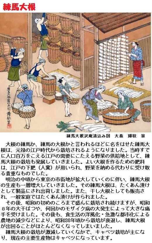 日本には弥生時代には伝わっており、平安時代中期の『和名類聚抄』巻17菜蔬部には、園菜類として於保禰(おほね)があげられています。ちなみにハマダイコンまたはノダイコンと見られる古保禰(こほね)も栽培され、現在のカイワレダイコンとして用いられていました。江戸時代には関東の江戸近郊である板橋・練馬・浦和・三浦半島辺りが特産地となり、その中で練馬大根は特に有名でした。