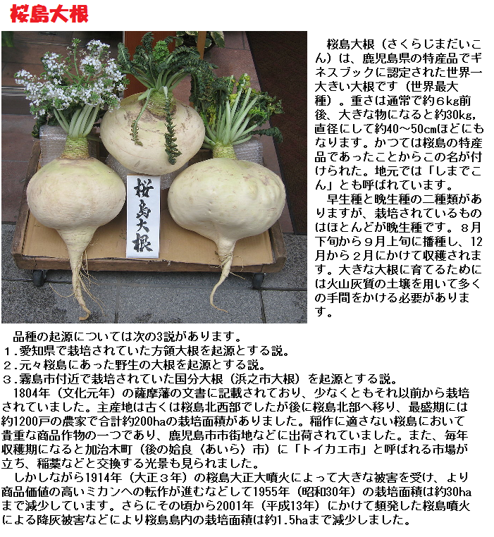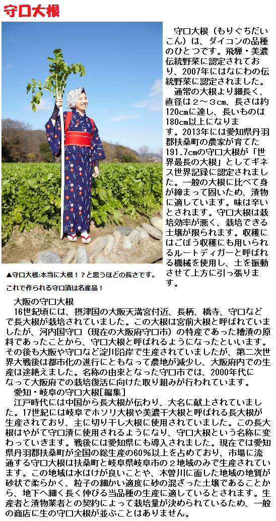 ダイコンは日本においては品種・調理法とも豊富です。世界一大きくて重い桜島大根、世界一長い守口ダイコンなどの種類があり、日本人の食卓(鍋料理・おでん等)には欠かすことのできない野菜となっています。葉はビタミンAを多く含み、青汁の原料として使われます。汁はビタミンCやジアスターゼを多く含んでいます。
