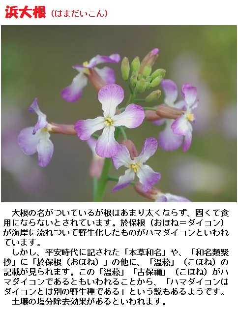 大根(ダイコン)はアブラナ科ダイコン属の越年草で、野菜として広く栽培されています。主に肥大した根を食用とするほか種子から油を採ることもあり、緑黄色野菜でもあり淡色野菜でもあります。名前の由来は、大きな根を意味する大根(おおね)からです。多くの品種があり、根の長さ・太さなどの形状もさまざまで、皮の色も白以外に赤・緑・紫・黄・黒などがあり、地域によっては白よりも普通です。日本ではほとんどが白い品種で、スズシロ(清白)の別名もこれに基づいています。
