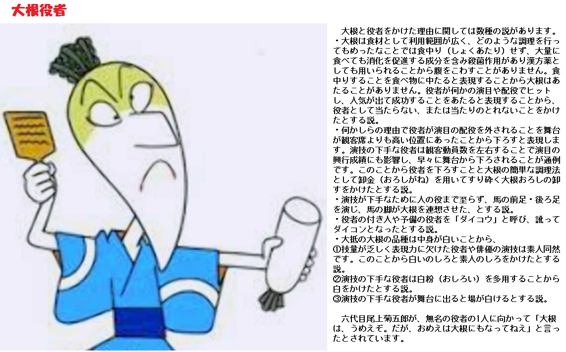 大根は、生でも煮ても焼いても消化が良くて食あたりしないので、何をやっても当たらない役者を「大根役者」と呼びます。同じ理由でどうしても当たりを打てない野球の打者を「大根バッター」とも呼ぶそうです。