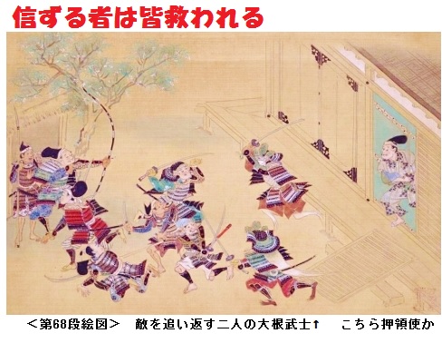 ある時、押領使が所管する館の中に兵がいない隙を見計らって、敵が襲ってきた。敵にすっかり取り囲まれていたのだが、館の中に二人の兵士が現れ、命も惜しまずに戦って、敵をみんな、追い返してしまった。押領使はとても不思議に思って、『日頃、この館で見ない者たちだが、ここまで懸命に戦うとは、どんな人物なのか?』と聞いた。すると、『あなたが長年信じてきて、毎朝召し上がっている大根でございます』と答えて、その勇敢な兵士は消えうせてしまった。