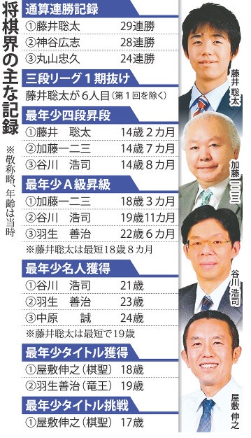 藤井四段の連勝記録は偉業だが、将棋界はタイトル獲得が最も評価される世界だ。藤井四段には、屋敷伸之九段(45)が持つタイトル獲得の最年少記録(棋聖、18歳)、谷川浩司九段(55)の最年少名人獲得記録(21歳)の更新の期待もかかる。