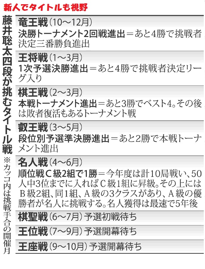 名人など、棋界で特別な権威を持つタイトルは現在、八つある。名人を除く7タイトルは原則、プロ入り初年からタイトルに挑戦、獲得することも可能だ。藤井四段の場合、今年度中に獲得する可能性があるのは竜王、王将、棋王の三つとなる。