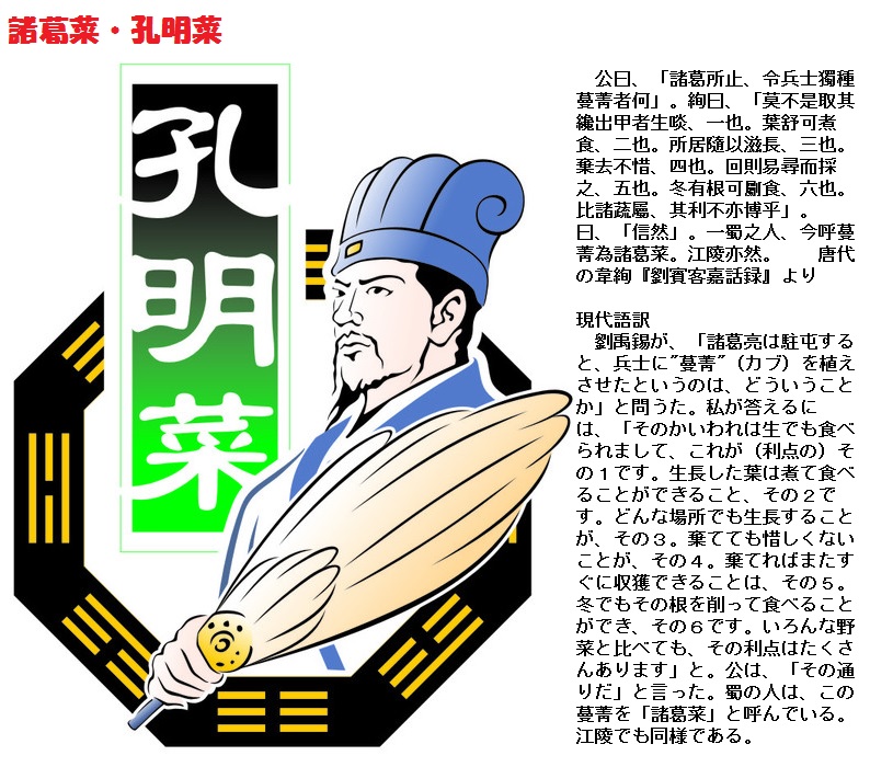 後漢の末期、孔明が劉備軍に加わったとき、軍中には新鮮な葉物がなかったので、兵士の食事は味気なく、士気が上がりませんでした。孔明は襄陽をまわって、「大頭菜(コールラビ)」がたくさん採れることを知り、調理方法を発明して、大頭菜の漬物を軍中のおかずとしました。孔明の漬物は、香りがよく、口触りも爽やかで、食欲も増すので、兵士たちに広く好まれました。蜀軍の士気は上がり、赤壁の戦いで勝利し、荊州、漢中を得て、三国鼎立の形勢になったのです。のちに蜀へ移ると、蜀は特産が豊かだったのですが、孔明はいつも大頭菜の漬物をおかずにしていました。玄徳が不思議に思ったところ、孔明は、「今の境遇は、これのおかげでした。しかしなお天下が定まりませんので、昔の志を忘れないようにしているのです」と答えたといいます。のちの人は孔明の忠義をしのんで、この漬物を、「孔明菜」と呼びました。「孔明灯」、「木牛」、「流馬」と合わせて、孔明の四大伝奇発明とされています。