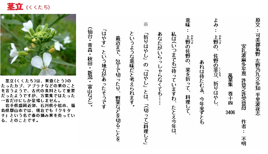土地土地で品種改良がおこなわれ、現在でも多くの品種が存在しています。また古くは茎立(くくたち)とも呼ばれていたようです。「万葉集」にも遠い九州に徴兵された男にカブを育ててご馳走しようという意味の歌が読まれており、奈良時代にはカブが高級品であったことが推測されます。