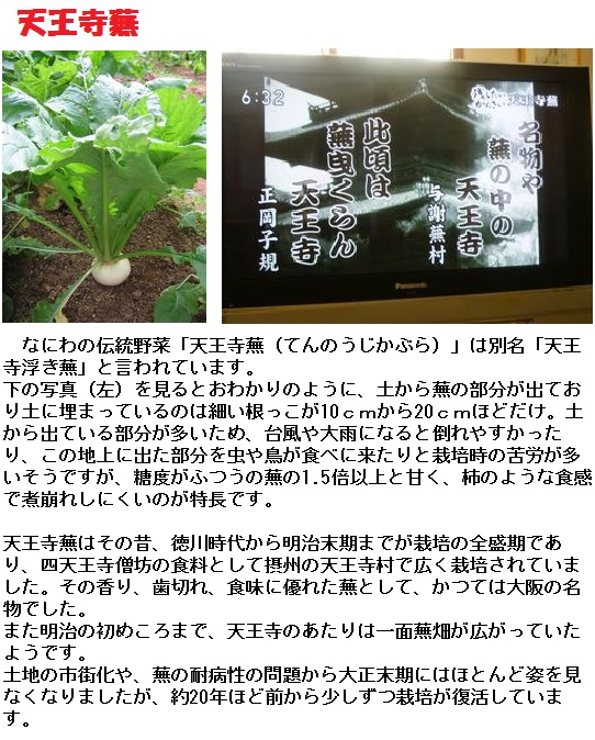 「蕪村」という名が「蕪の村」と書くのは、当時彼が住んでいた大坂の天王寺村が、「天王寺かぶら」という白色中型の蕪の一大産地だったからで、蕪村は、「名物や 蕪の中の 天王寺」という句を残しています。