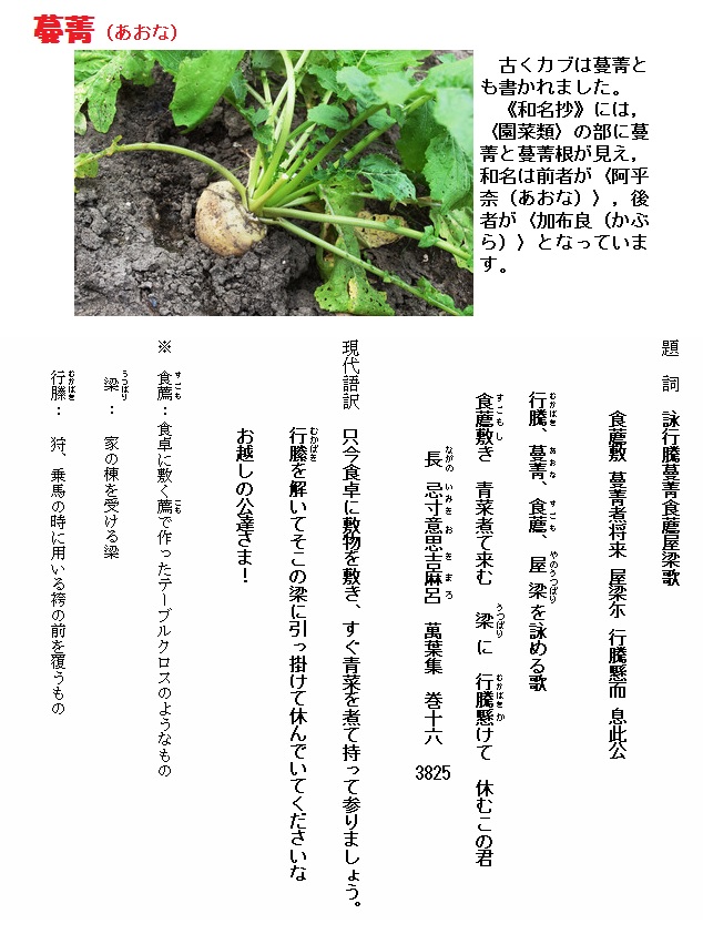 日本では、古事記の「吉備の菘菜(あおな)」が蕪のことと見られるほか、日本書紀に持統天皇が栽培を推奨したと記されています。京野菜など西日本で見られる中国伝来のアジア系とともに、東日本でヨーロッパ系(野沢菜など関連する変種も含む)が在来種として確認され、シベリア経由と見られています。