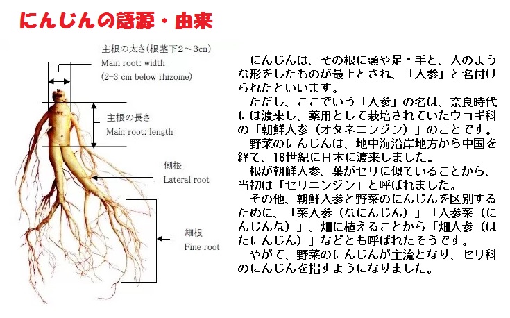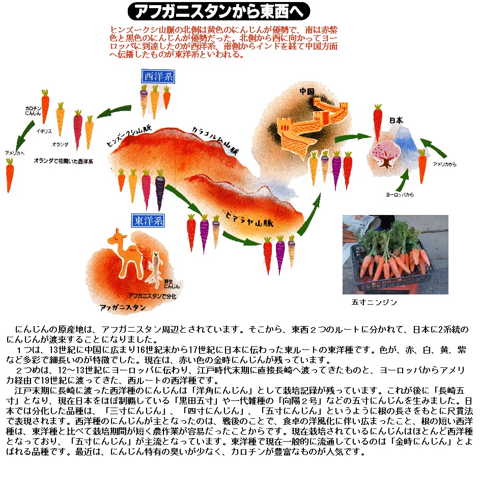 ニンジンは原産地のアフガニスタン周辺で東西に分岐し、世界各地に伝播しました。オランダを通りイギリスへと西方へ伝来しながら改良が行われた西洋系、中国を経て東方へと伝わった東洋系の2種類に分類できます。東洋系は細長く、西洋系は太く短いが、ともに古くから薬や食用としての栽培が行われてきました。