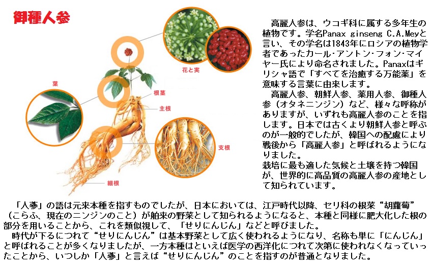 「御種人蔘」の名は、八代将軍徳川吉宗が対馬藩に命じて朝鮮半島で種と苗を入手させ、試植と栽培・結実の後で各地の大名に「御種」を分け与えて栽培を奨励したことに由来します。これ以前の「人蔘」は朝鮮半島からの輸入に依存していました。