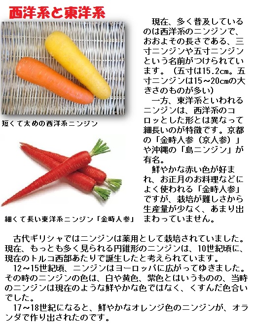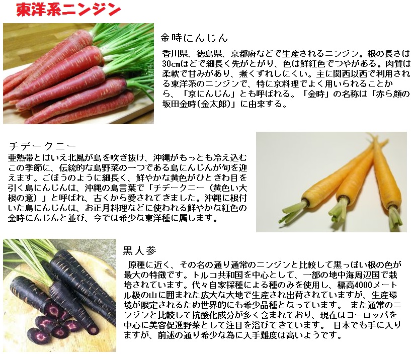中国で改良された東洋系のニンジンは、16世紀に日本に伝えられ、各地で作られるようになりました。赤色の金時にんじんを筆頭に、甘味が強くてニンジン特有の臭みが少なく、煮ても形が崩れにくいので和風の料理に重宝されます。なかでも京料理では比較的多く用いられることから金時ニンジンは「京人参」とも呼ばれ、京野菜のひとつに数えられています。しかし、栽培しにくいことがネックとなり、第二次世界大戦後西洋系ニンジンが主流となってきています。正月料理用などとして、現在でも晩秋から冬にかけて市場に出回りますが、栽培量が少ないためこの季節以外では入手することが難しいようです。この他沖縄県の伝統野菜のひとつで黄色い島ニンジンまたはチデークニーと呼ばれる品種や、アフガニスタン原産の黒人参などが東洋系に含まれます。