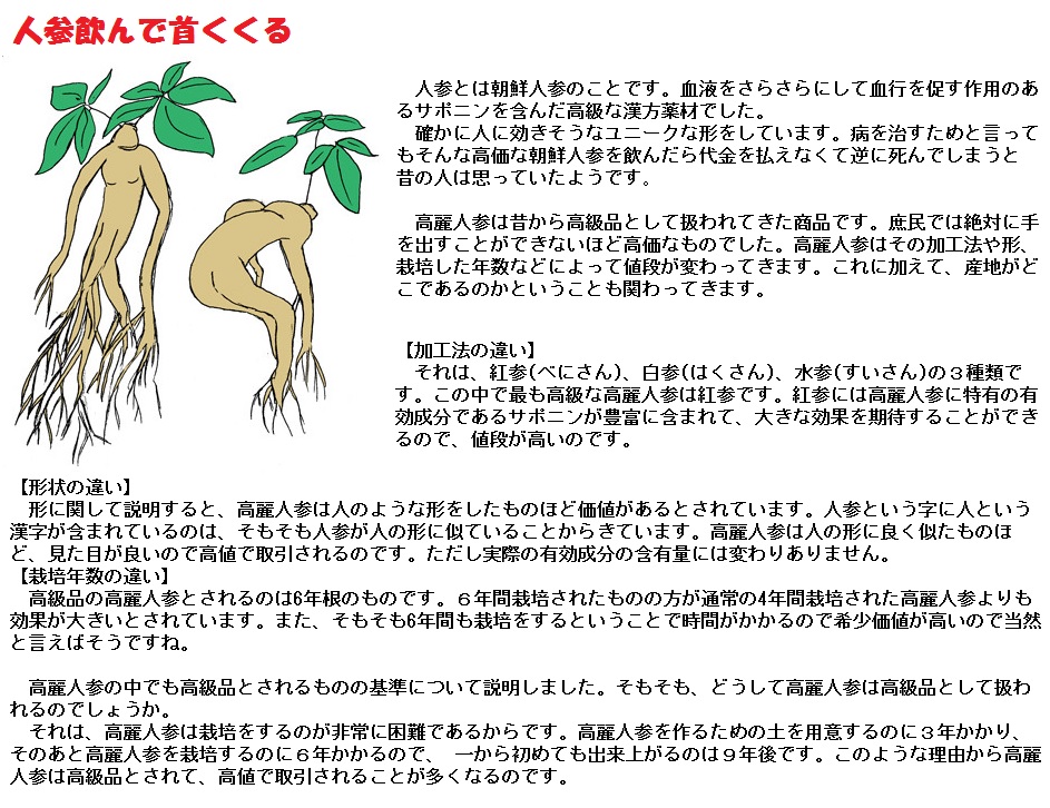 江戸時代には大変に高価な生薬で、庶民には高嶺の花でした。このため、分不相応なほど高額な治療を受けることを戒める「人蔘飲んで首括る」のことわざも生まれました。「人参で行水」は医薬のかぎりを尽くして治療をすることをいいます。