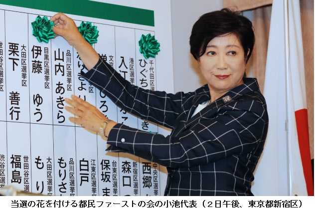 小池系圧勝、自民半減以下の惨敗 都議選 ―― 2日投開票された東京都議選(定数127)の全議席が確定した。小池百合子知事が代表を務める地域政党「都民ファーストの会」が49議席で第1党となり、公明党などを合わせた知事支持勢力で過半数を大きく上回る圧勝となった。自民党は過去最低の38議席を下回る23議席にとどまる歴史的な大敗となった。公明党は7回連続の全員当選を果たした。再登板後、選挙で連戦連勝してきた安倍晋三首相(自民党総裁)の政権運営に打撃となるのは避けられない。