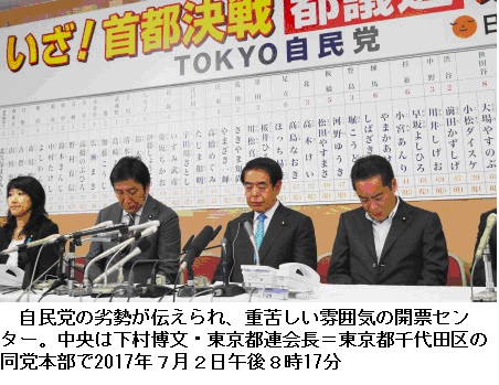 自民は市場移転問題で小池氏が示した「豊洲移転・築地再開発」の玉虫色の判断を引き合いに、「決められない知事」と攻勢をかけた。だが、加計学園問題や「共謀罪」法の採決強行などで内閣支持率が急落。さらに選挙戦で稲田防衛相が「自衛隊、防衛相としてもお願いしたい」と、自衛隊の政治利用とも取れる発言をし、逆風にさらされた。