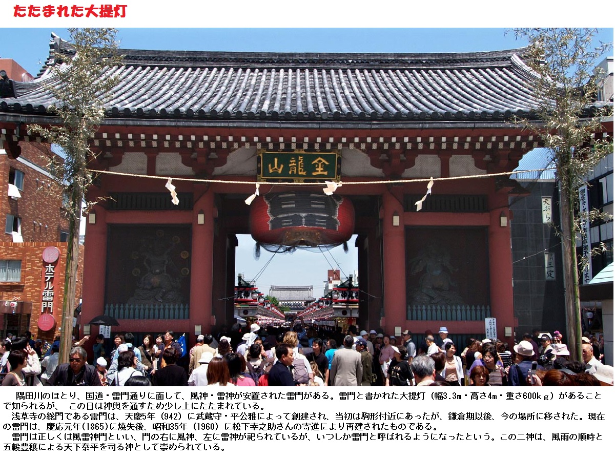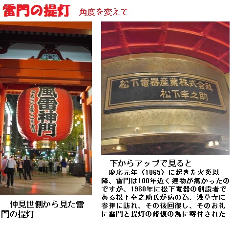 雷門にかかる大提灯は浅草のシンボルとなっています。本体は丹波産の竹の骨組みに福井県産のコウゾ100%の和紙約300枚を貼り合せたもので上下の張り輪には金属製の化粧輪が取り付けられているそうです。1971年から京都市下京区の高橋提燈が制作しており約10年ごとに新調されているそうです。なお、2008年に松下電器はパナソニックに社名変更しましたが、大提灯の銘板は松下電器のままだそうです。2003年に江戸開府400年を記念して改めて新調された際、提灯は従来の物より一回り大きくなり、直径3.3m、高さ3.9m、重さ700kgとなりました(従来の物は670kgでした)。2013年に新調された大提灯で5基目となります。三社祭の際には、神輿が下を通るため提灯が持ち上げられて畳まれます。また、台風接近時や強風時にも破損を防ぐために畳まれます。